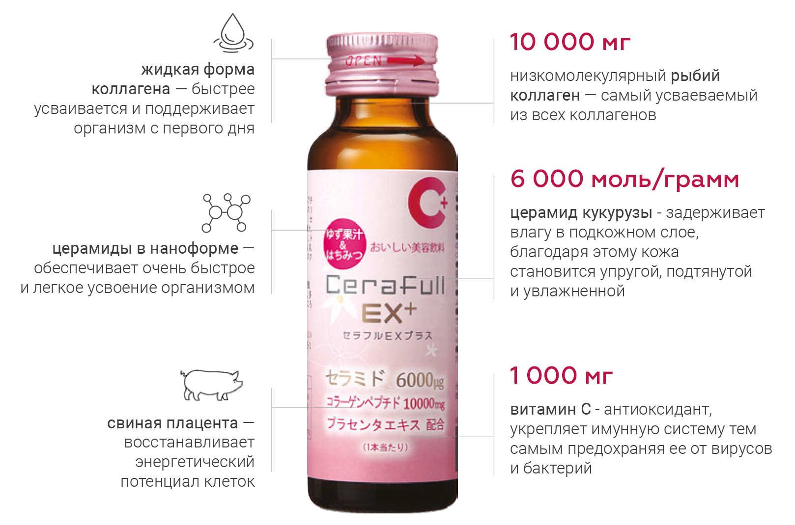 Бьюти-напиток Ureshino CeraFull EX+ – жидкий водорастворимый питьевой коллаген в концентрации 10 000 мг на основе церамидов в концентрации 6000 г/моль, наноколлагена, плаценты и витамина С в концентрации 1000 мг для поддержания молодости, здоровья и хорошего самочувствия. Бьюти-напиток был разработан благодаря 25-летним исследованиям в лаборатории Цуджи, в результате которых был получен уникальный продукт, в котором все ингредиенты усиливают действие друг друга. Годы исследований и передовые японские технологии позволили создать системный, продуманный подход к активному омоложению, оздоровлению и поддержанию тонуса организма.